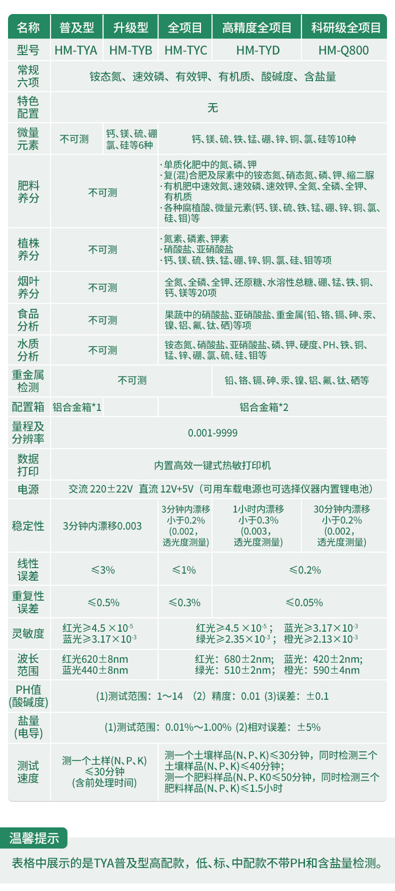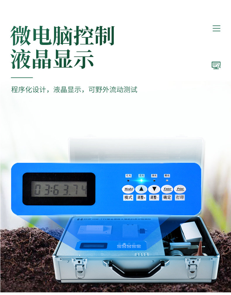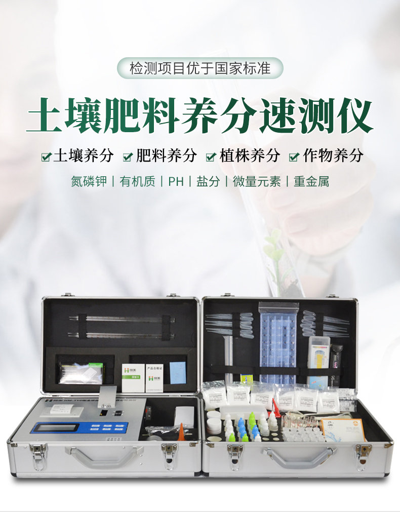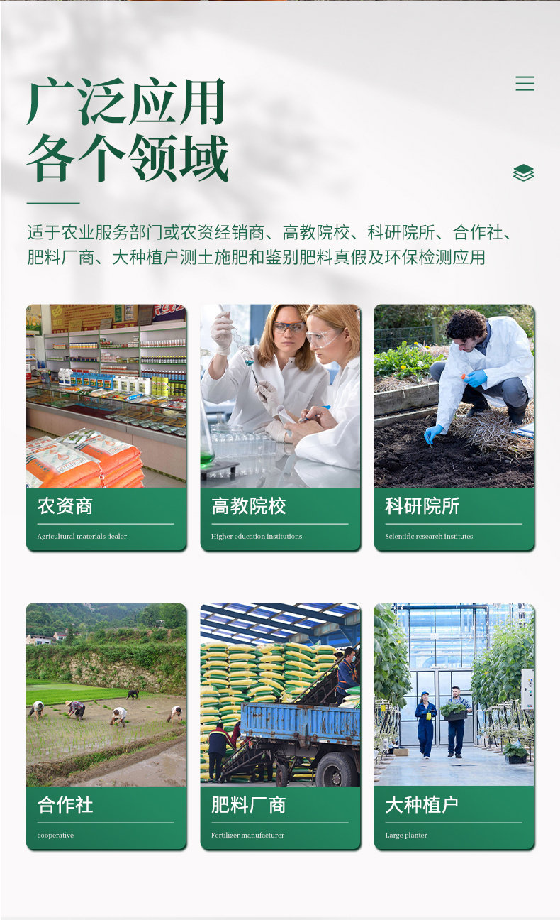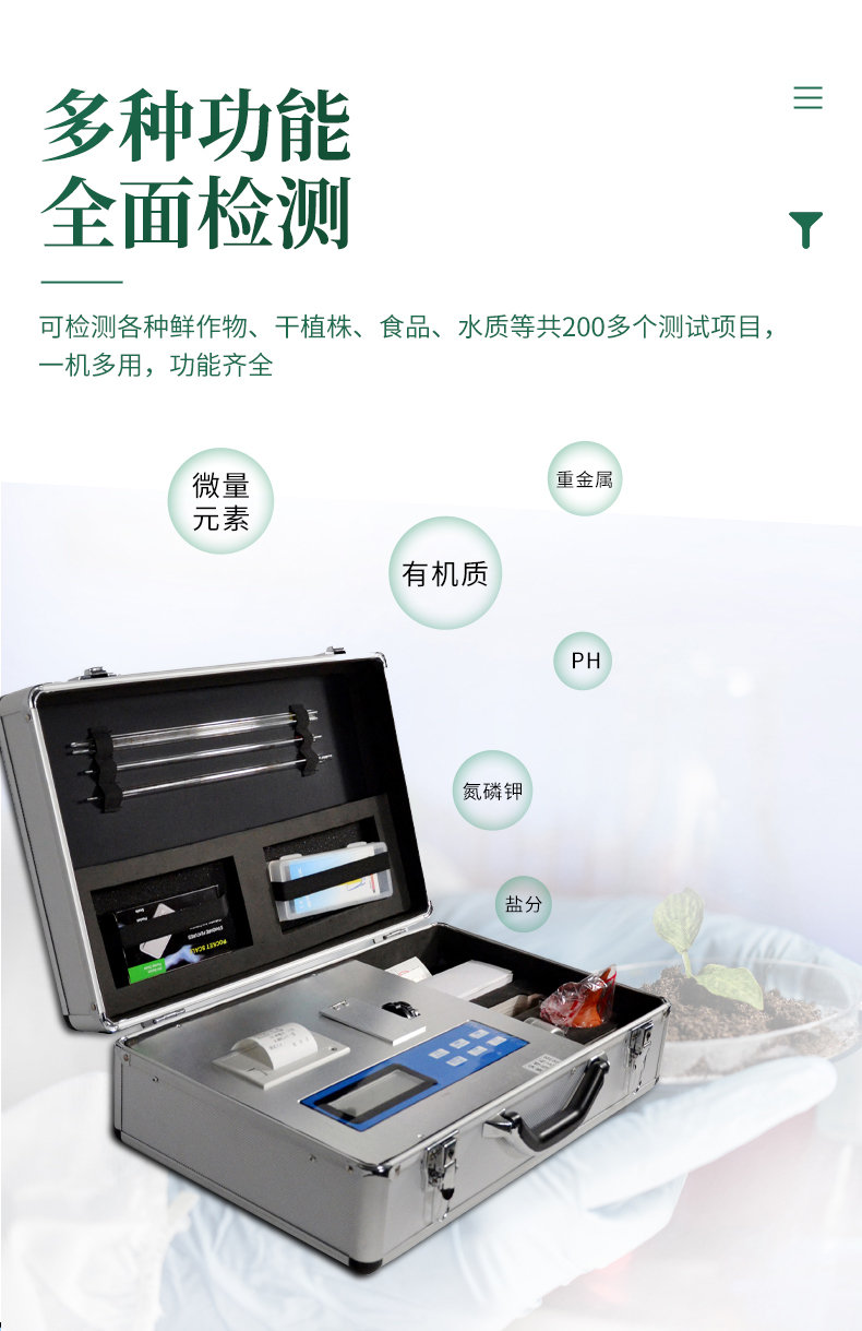配套齊全:該儀器集藥、器、儀為一體,攜帶方便,相當(dāng)于一個小型實驗室。適于農(nóng)業(yè)服務(wù)部門或農(nóng)資經(jīng)銷商、肥料廠商測土施肥和鑒別肥料真假。