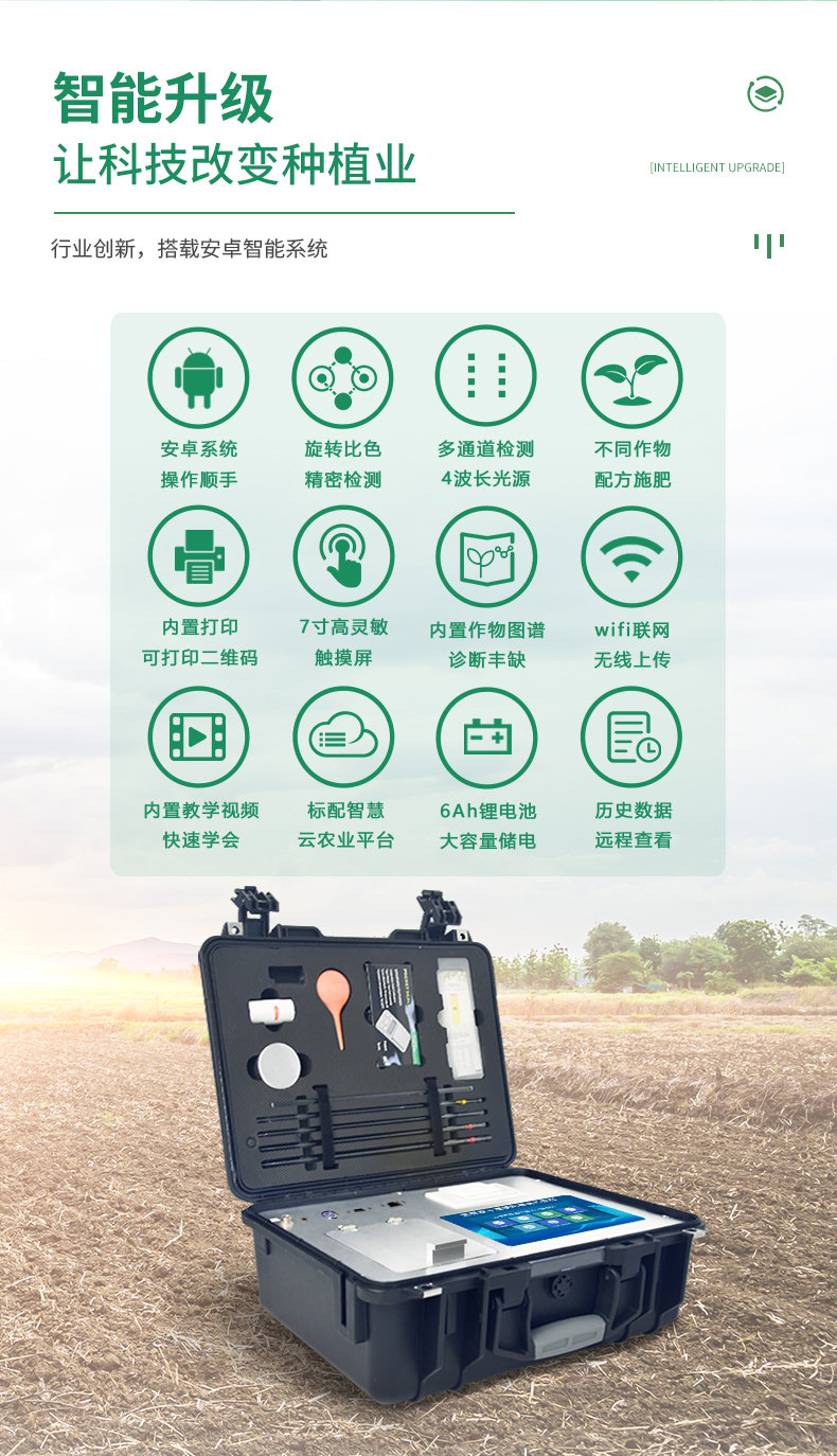 配套齊全:該儀器集藥、器、儀為一體,攜帶方便,相當(dāng)于一個(gè)小型移動(dòng)實(shí)驗(yàn)室,亦可野外流動(dòng)測(cè)試。適于農(nóng)業(yè)服務(wù)部門(mén)或農(nóng)資經(jīng)銷(xiāo)商、合作社、肥料廠(chǎng)商、大種植戶(hù)測(cè)土施肥。