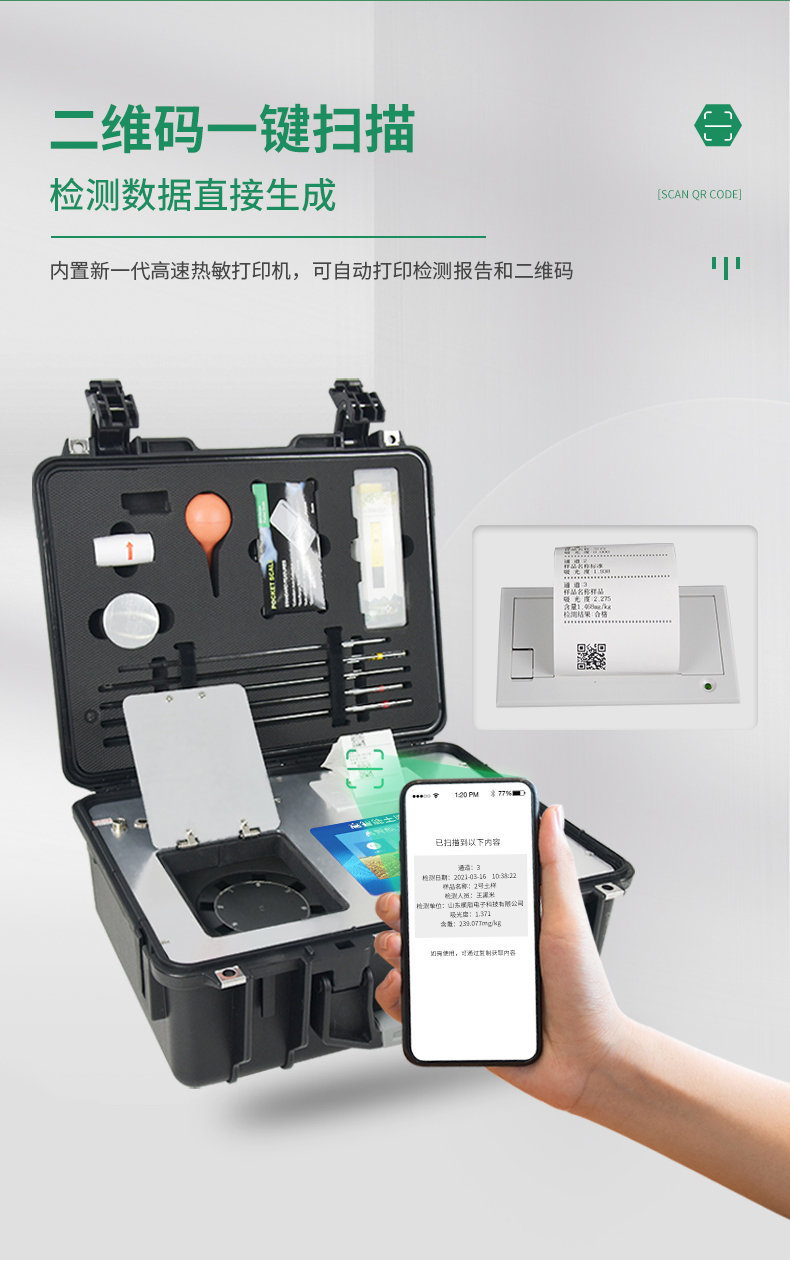 15、內(nèi)置新一代高速熱敏打印機(jī)(無(wú)需色帶),打印內(nèi)容包含:檢測(cè)單位、檢測(cè)人員、檢測(cè)項(xiàng)目、通道號(hào)、吸光度、養(yǎng)分含量(mg/kg)、檢測(cè)時(shí)間、以及二維碼等信息