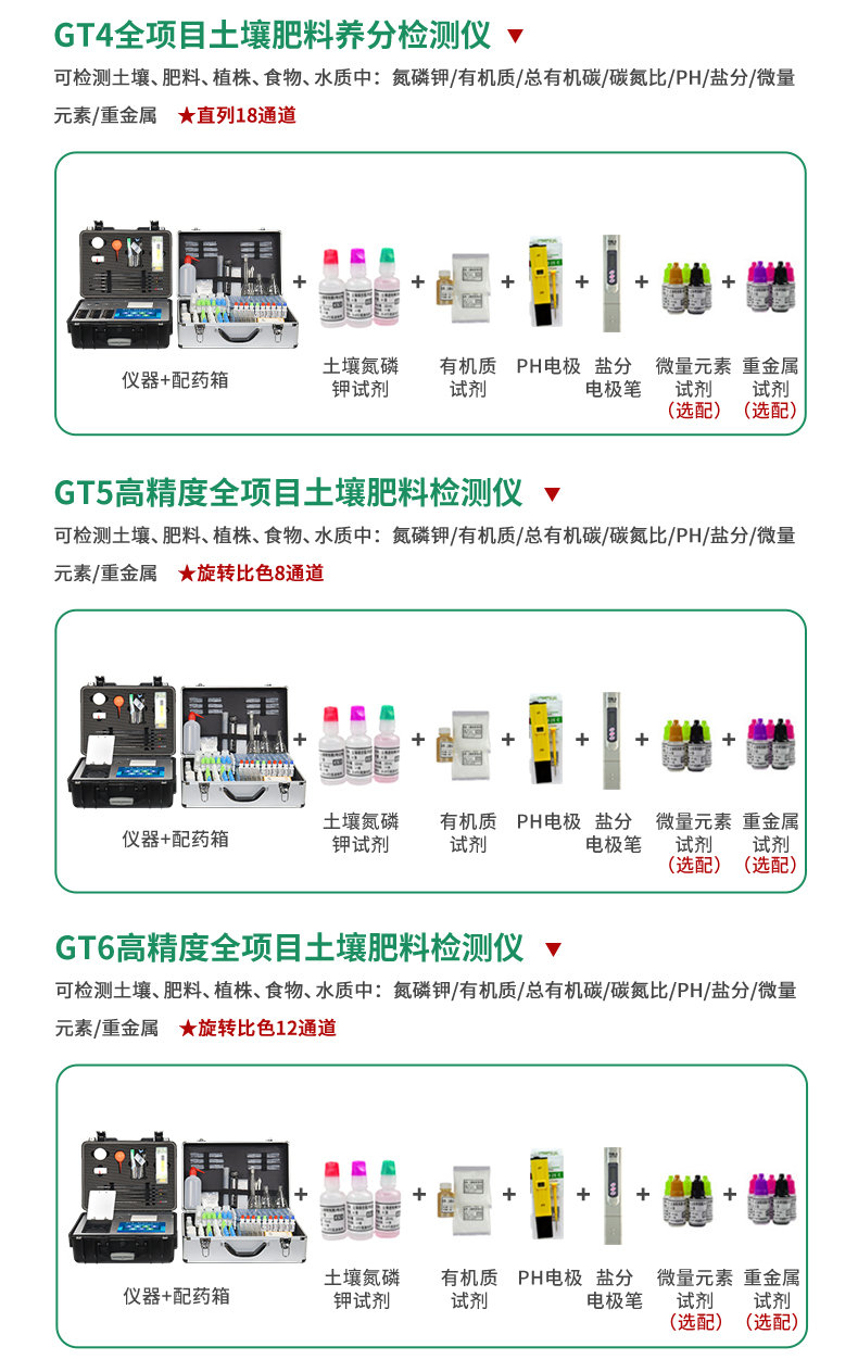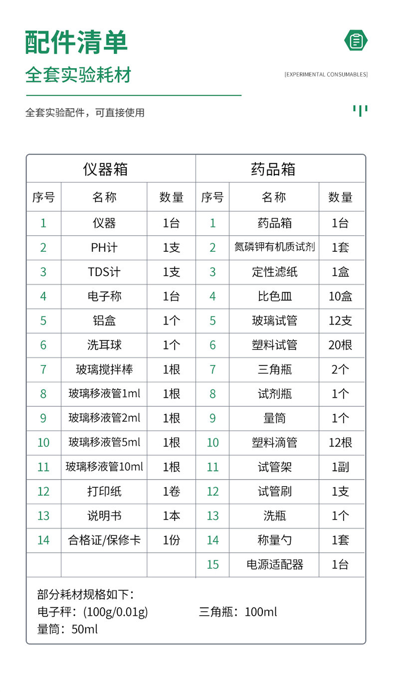 | 2 | PH計(jì) | 1支 | 2 | 氮磷鉀有機(jī)質(zhì)試劑 | 1套 |
