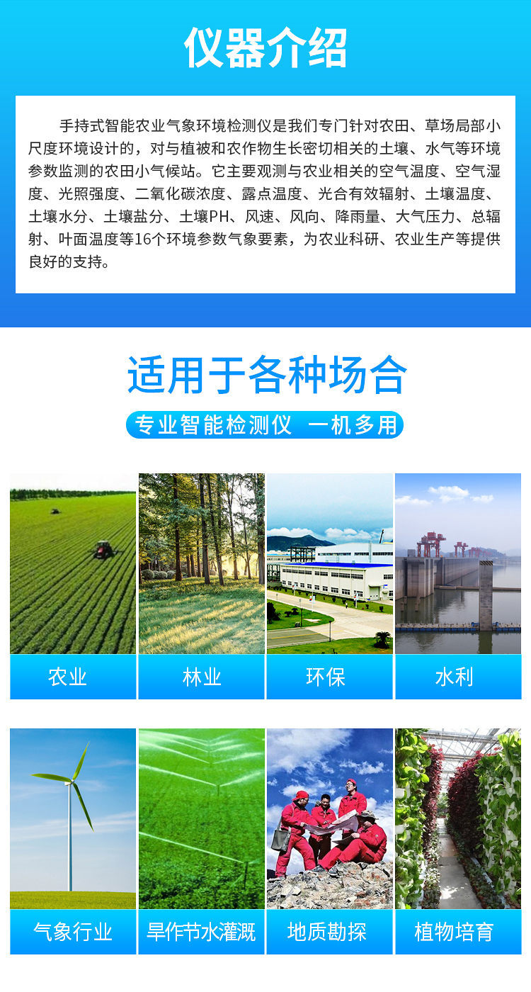 廣泛應用于農業(yè)、林業(yè)、環(huán)保、水利、氣象行業(yè)、旱作節(jié)水灌溉、地質勘探、植物培育等領域。