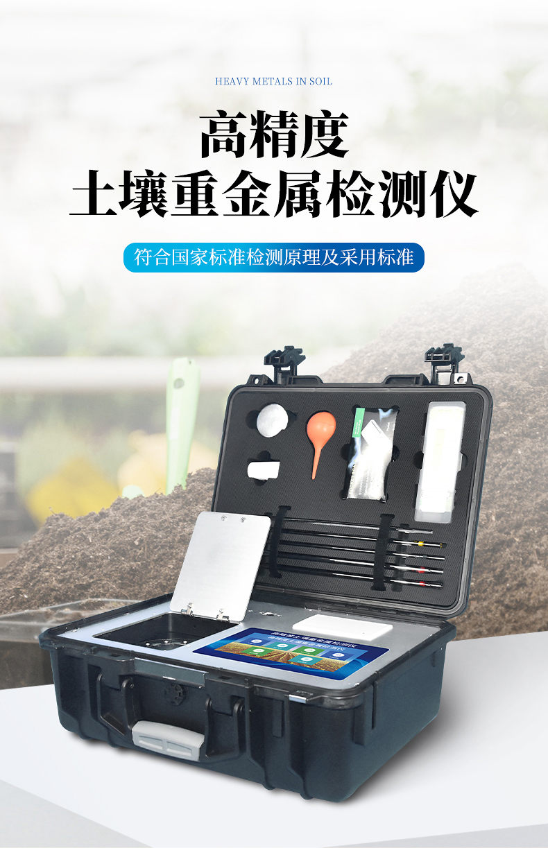 土壤重金屬污染問(wèn)題日益嚴(yán)重,造成土壤耕作層內(nèi)的鎘、銅、砷、鉻、汞、鐵、鋅、錳、銅、鎳、鋁、氟、鈦、硒等重金屬大量富積、積累,成為當(dāng)下面臨的主要環(huán)境問(wèn)題之一。土壤中的重金屬通過(guò)在作物體內(nèi)富集進(jìn)入食物鏈,對(duì)人畜健康造成嚴(yán)重威脅。有色金屬礦山的開(kāi)采、 工業(yè)“三廢”的排放、含重金屬?gòu)U棄物堆積、農(nóng)業(yè)生產(chǎn)中的污水灌溉,農(nóng)用化學(xué)藥品的不合理使用等,都可能導(dǎo)致有害重金屬元素直接或間接進(jìn)入土壤,導(dǎo)致土壤、作物、果蔬、水質(zhì)、水產(chǎn)品等重金屬含量嚴(yán)重超標(biāo)。但是當(dāng)前重金屬測(cè)定方法測(cè)定速度慢、步驟繁瑣且儀器昂貴?;谶@種形勢(shì),我們開(kāi)發(fā)出了重金屬快速測(cè)定方法。