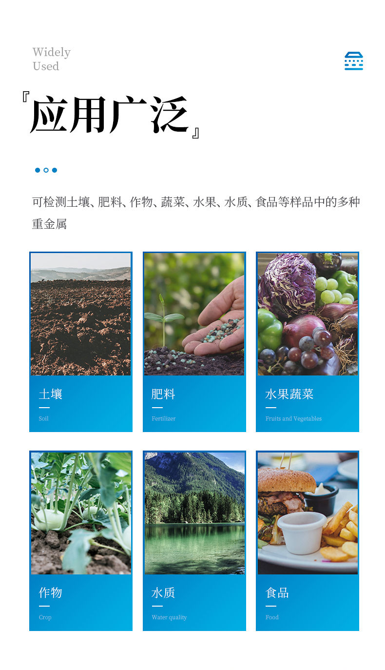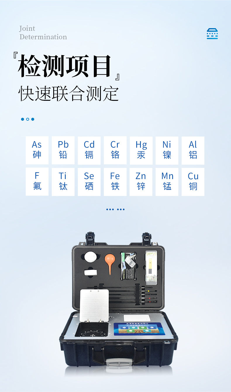 可對(duì)土壤、肥料、作物、蔬菜、水果、水質(zhì)、食品等樣品中的砷、鉛、鎘、鉻、汞、鎳、鋁、氟、鈦、硒、鐵、鋁、鋅、錳、銅等進(jìn)行快速聯(lián)合測(cè)定。
